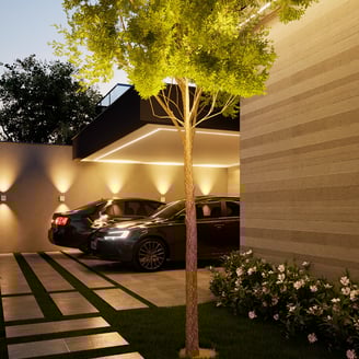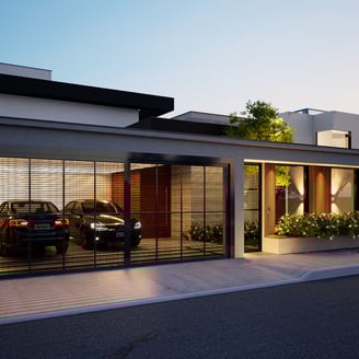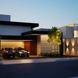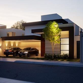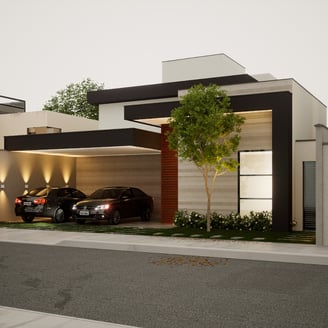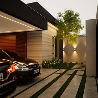 Concreto aparente, madeira natural, beirais destacados em preto e cobertura embutida dão a tônica contemporânea e sofisticada para essa residência. No interior, o pé-direito duplo na sala e aberturas generosas permitem a circulação cruzada de vento, promovendo conforto térmico mesmo em dias quentes.